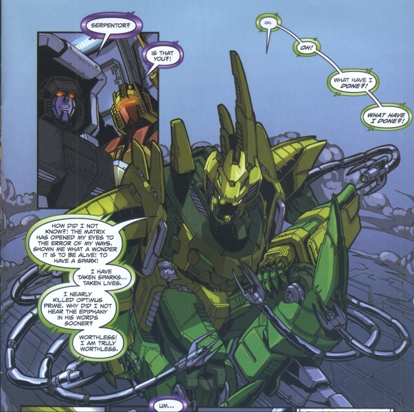 Hours or days or weeks later, Dead End lifted his head from where he lay upon a bier in a great domed vault. Ancient dust lay thick upon the stone floor; coiled about him was the metallic green and yellow form of Nycea, her tendrils still inserted deep into intimate circuits beneath his hood. He shook his head carefully to clear the languor from his mind, and toggled the Stunticon command channel.