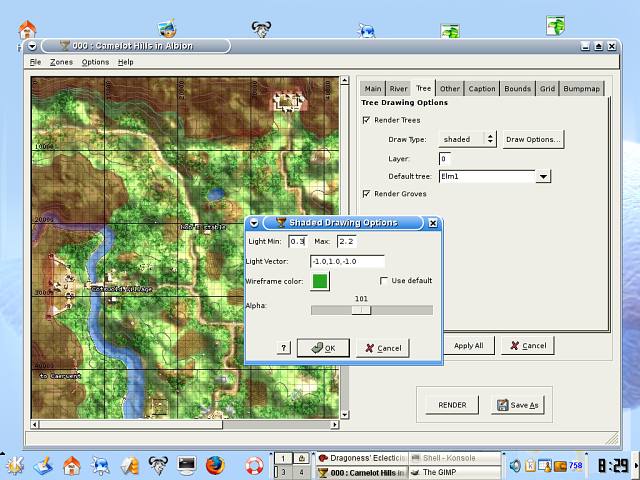 • Trees: are special. Trees are one of the items that are defined as having one of several drawing types (shaded, wireframe, solid, etc). Each drawing type has its own parameters, so there's a pop-up dialog to configure the drawing type. Also, several versions back, I added a 'default tree' model, one that's used when mapper.py can't find the tree model that's supposed to be there. I figured it was better to draw any tree where there was supposed to be a tree than to not draw a tree at all. You can now decide which tree model to use as your generic 'default tree' instead of being stuck with my choice of 'Elm1'. (There's a drop-down that lists all the models found in the 'Trees' folder of your game.)
