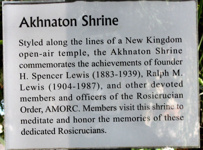 "Styled along the lines of a New Kingdom open-air temple, the Akhnaton Shrine commemorates the achievements of founder H. Spencer Lewis (1883-1939), Ralph M. Lewis (1904-1987) and other devoted members and officers of the Rosicrucian Order, AMORC. Members visit this shrine to meditate and honor the memories of these dedicated Rosicrucians."